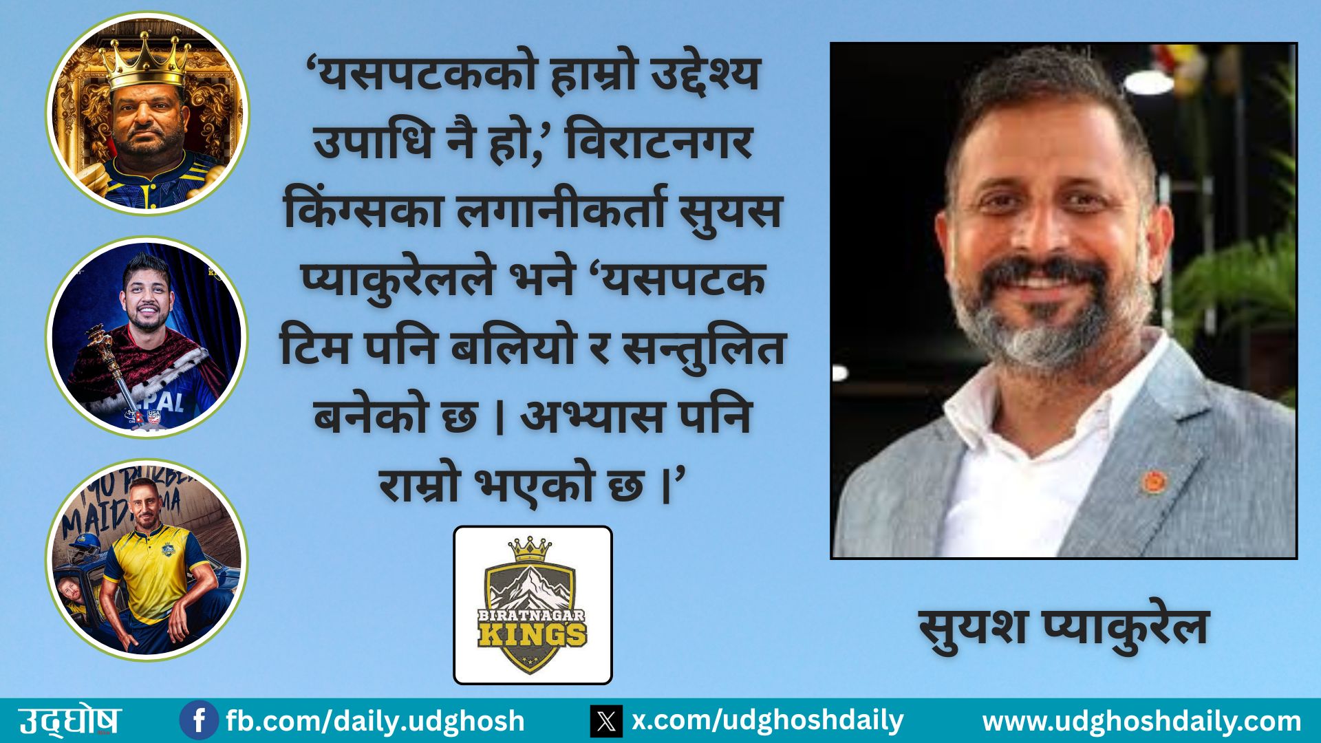 विराटनगर । कीर्तिपुरस्थित त्रिवि अन्तर्राष्ट्रिय क्रिकेट मैदानमा मंसिर १ यता जे घटित भइरहेको छ त्यसको सोझो प्रभाव सुदुरपूर्वको शहर विराटनगरमा देखिइरहेको छ । यसको कारण बनेको छ, यहाँको टिम विराटनगर किंग्सको लगातारको सफलता । नेपाल प्रिमियर लिगका खेलहरू अघि बढिरहदा औद्योगिक नगरी विराटनगरमा खुसीको ग्राफ पनि लगातार उकालो लाग्ने क्रममा छ । सोमबार एनपीएलमा साविक विजेता जनकपुर बोल्ट्सविरूद्ध रवाफ देखाउँदै विराटनगरले जीतको ह्याट्रिक गर्दा विराटनगरको खुस...
