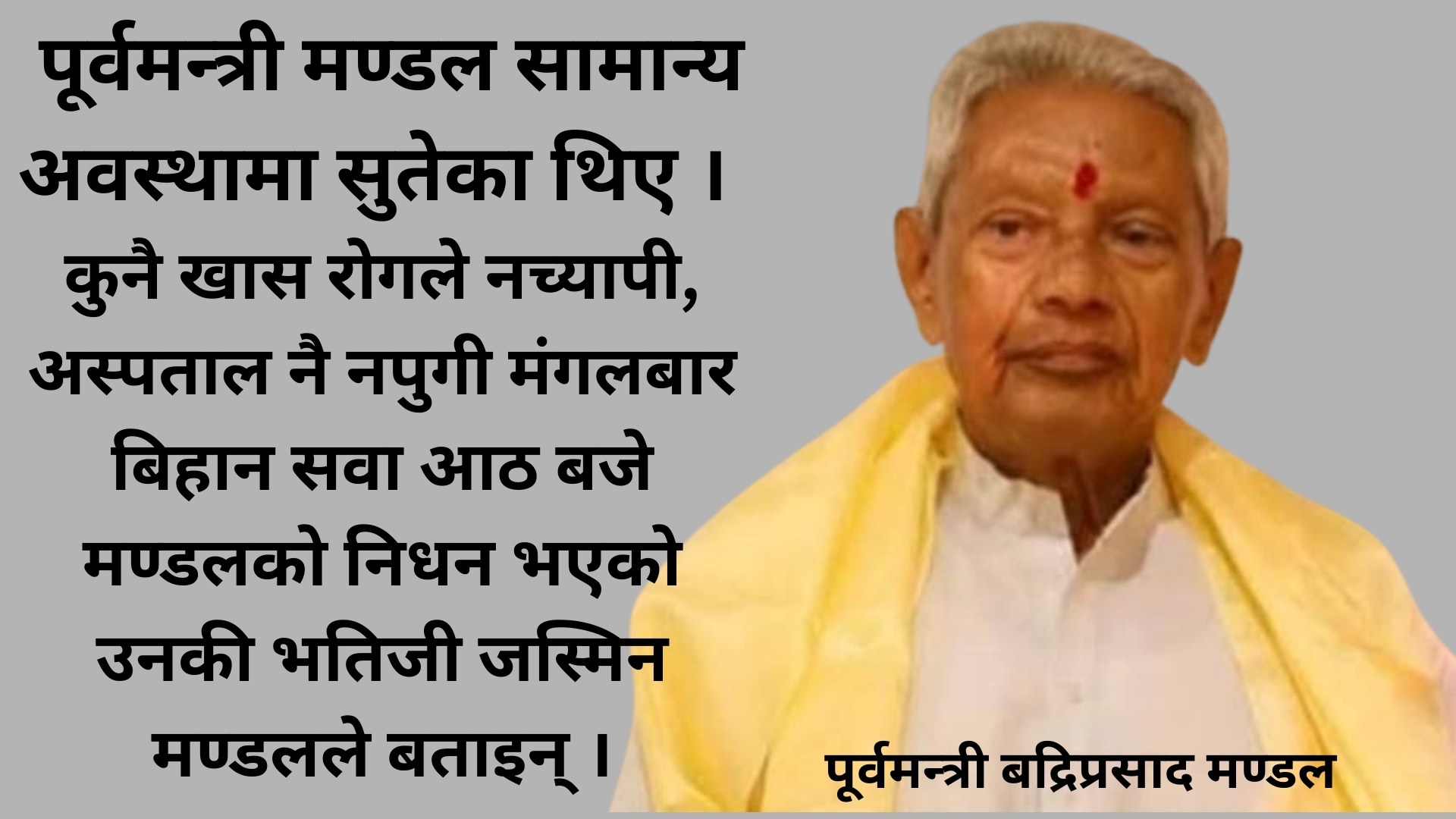 विराटनगर । पूर्वमन्त्री बद्रिप्रसाद मण्डलको मंगलबार बिहान निधन भएको छ । विराटनगर–९ घोघापुल चोकस्थित घरमा ८८ वर्षको उमेरमा मण्डलको निधन भएको हो ।